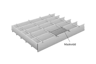| Maskvidd: | Fria avståndet mellan två bärstänger och två tvärstänger c/c materialet. |
